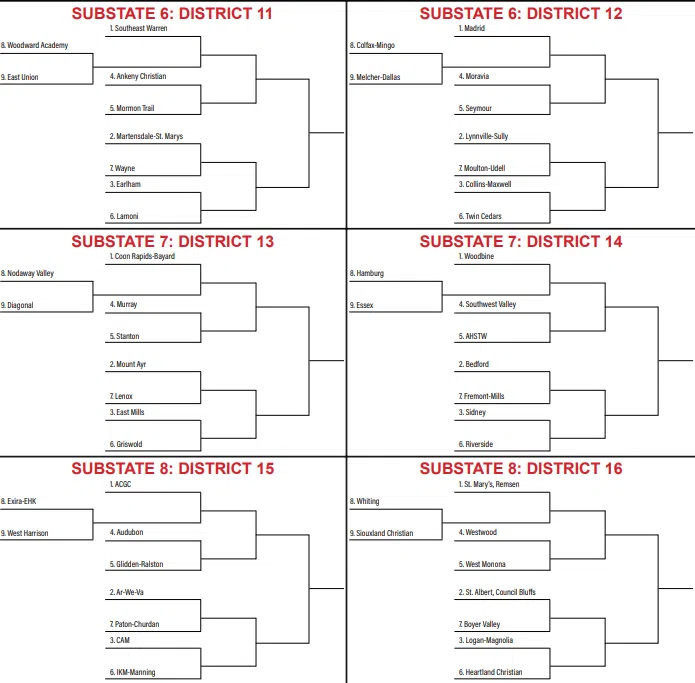 (Boone, IA) — The Iowa High School Athletic Association has released the post-season brackets for high school boys basketball in Class 1A and 2A. AC/GC and Madrid are two of the top two teams in the state and are in the same conference but have been put in different substates. AC/GC is the #1 seed in District 15 while Remsen St. Mary’s is the #1 seed in District 16 and both teams are in Substate #8. Coon Rapids Bayard and Woodbine are also in the same conference and are in the same substate — the Crusaders are #1 seed in District 13 and Eagles the #1 seed in District 14 but both teams are in Substate #7.