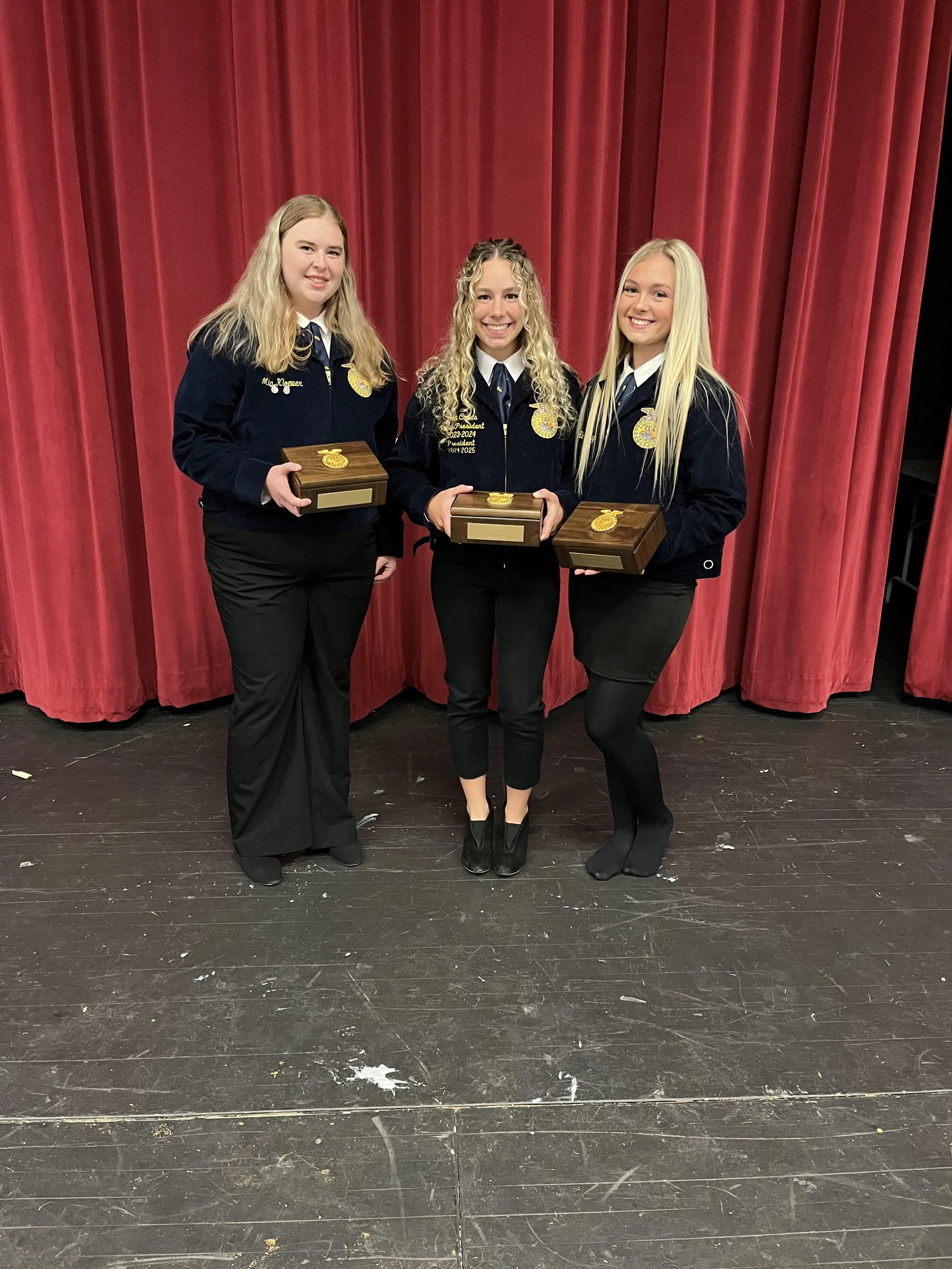 Following the reports, awards were presented. First were the members recognized for earning 10,000 FFA points during their time in the chapter. These points are earned by participating in chapter activities and events. Those recognized for reaching 10,000 points included Mia Kloewer, Lola Comes, and McKenna Sonntag.