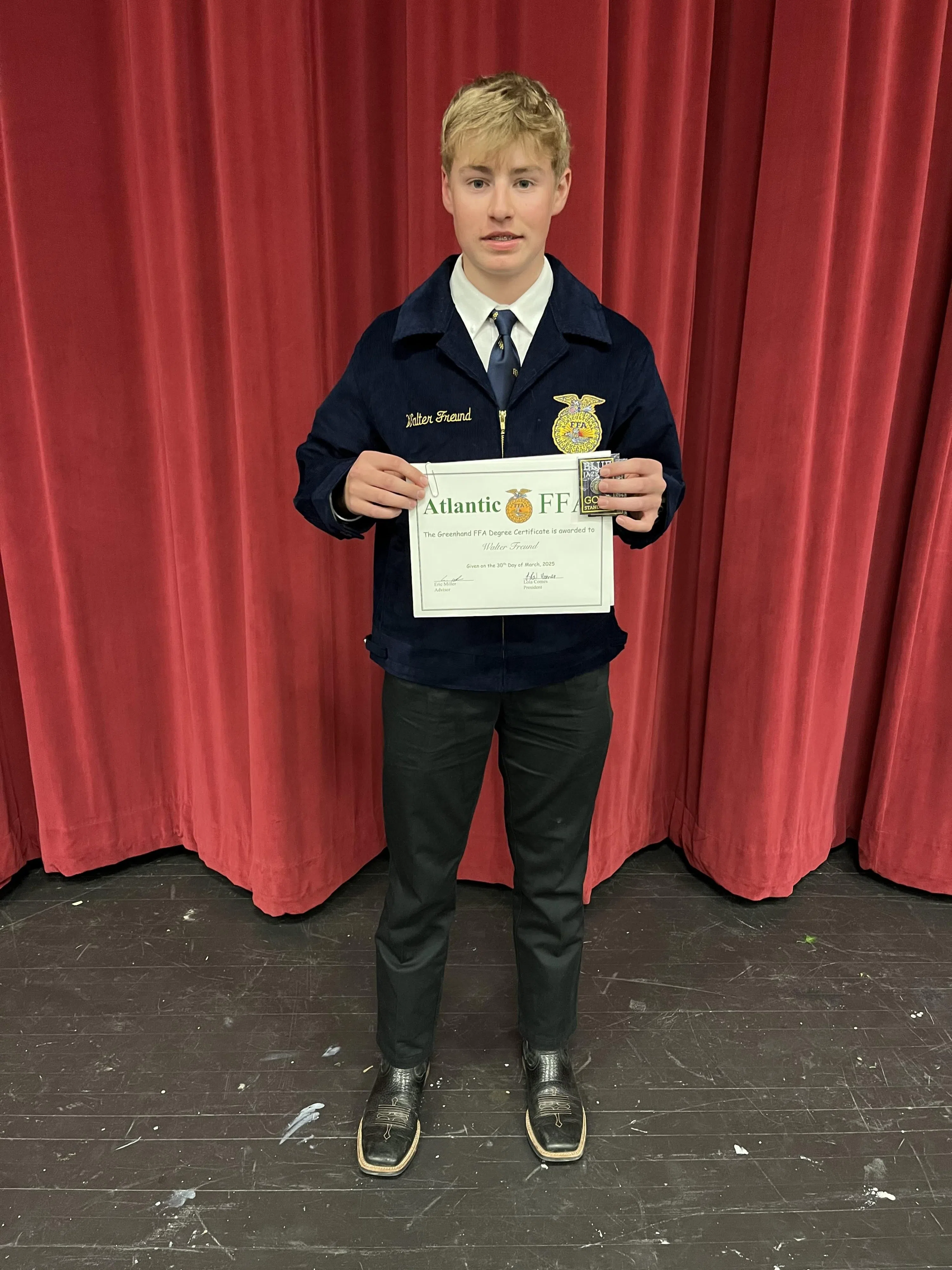The next award was the Academic Achievement Award, given to members who have been part of the Atlantic FFA chapter for at least three years and maintained a GPA of 3.5 or higher throughout. Recipients included Carter Witzman, Lola Comes, Joci Zarbaono, McKenna Sonntag, and Mia Kloewer.