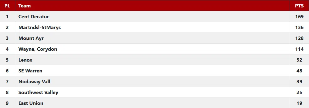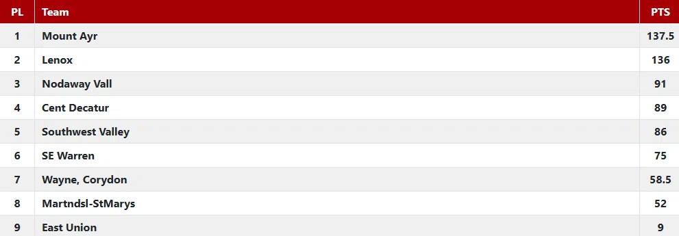 (Greenfield, IA) — Mount Ayr edged Lenox by one and a half points to win the Boys title in the Pride of Iowa Track and Field meet on Monday night. Central Decatur dominated the girls side. Gabe Winkelmann and Trent Warner of Nodaway Valley were double conference winners — Winkelmann won the 1600 (4:47.85, season PR) and the 3200 (10:58.80) and Warner won the throws with two season PRs (54-11 in the Shot Put and 170-11 in Discus which is a PR by 19 feet).