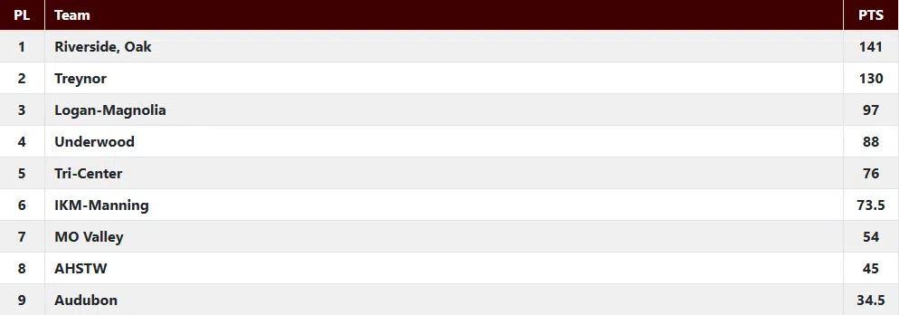 (Treynor, IA) — The Western Iowa Conference is loaded with track and field talent — for instance the top four finishers in the Boys 400 Hurdles all made it to the Drake Relays. That is unheard of for a conference that is largely full of 1A and 2A schools. So times were low on Tuesday’s conference meet and Riverside came from behind to edge Treynor for the Boys team championship while the Treynor Cardinals blew past everyone to win the Girls team title. It was a very fast meet with 13 conference records that were broken. Here is a team by team breakdown: