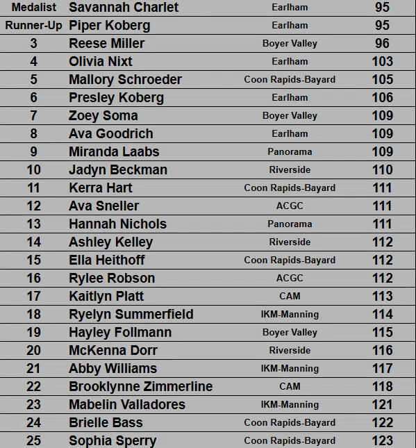 (Dunlap, IA) — It was not the ideal conditions for golf on Friday but the first round of the Girls Regionals was played nevertheless. Boyer Valley hosted the Class 1A, Region 2B meet and only three golfers were able to break 100. Earlham’s Savannah Charlet and Piper Koberg each shot a 95 and Charlet won on a tiebreak. It was Charlet’s 17th birthday. Reese Miller of Boyer Valley was one stroke back with a 96. Rounding out the top 6 were Olivia Nixt of Earlham (103), Mallory Schroeder of Coon Rapids Bayard (105) and Presley Koberg of Earlham (106) — the top six qualify for the regional finals.
