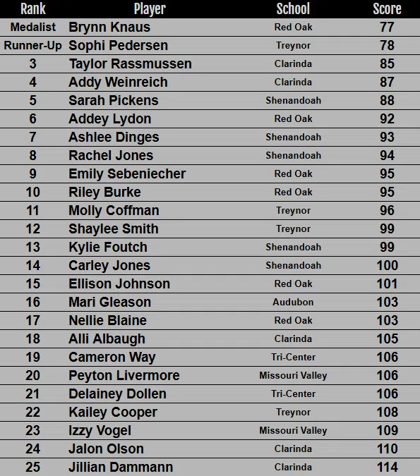 (Red Oak, IA) — Red Oak had the advantage of the home course in a Class 2A first round regional meet and they used it — the Tigers won the first round regional meet with a score of 359, Hawkeye Ten Conference rival Shenandoah finished 2nd with a 374 and Treynor advanced with a 381. (In girls golf regional first round, when the home course team finishes either first or second, the third place team also advances).