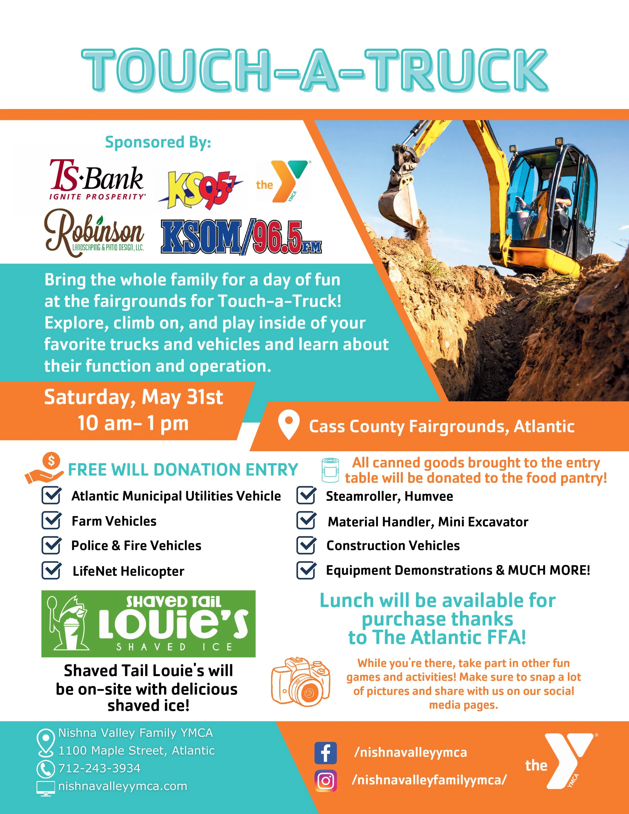 (Atlantic) Big trucks, flashing lights, and smiling faces will fill the Cass County Fairgrounds on Saturday, May 31st, as the popular Touch-a-Truck event returns from 10:00 AM to 1:00 PM.