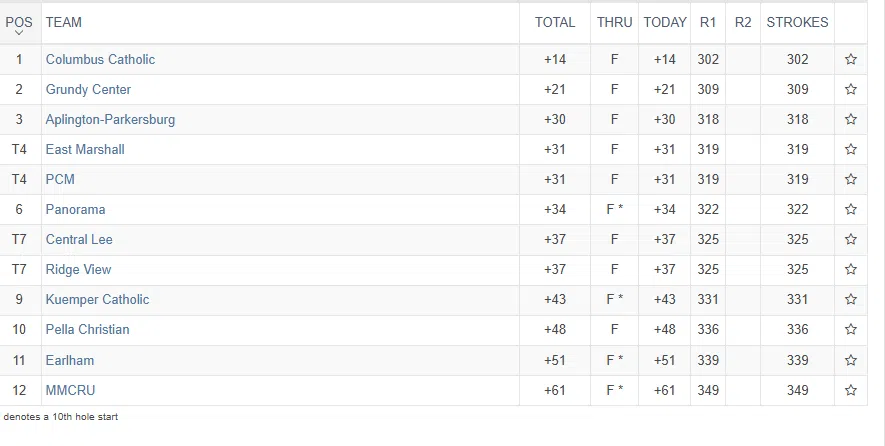 (Waterloo) Columbus Catholic holds the top spot in Class 2A after the opening round of play at Gates Park Golf Course in Waterloo. The Sailors posted a team score of 14-over-par 302. Panorama currently sits in sixth place out of 12 teams with a 322, while Kuemper is in ninth at 331.