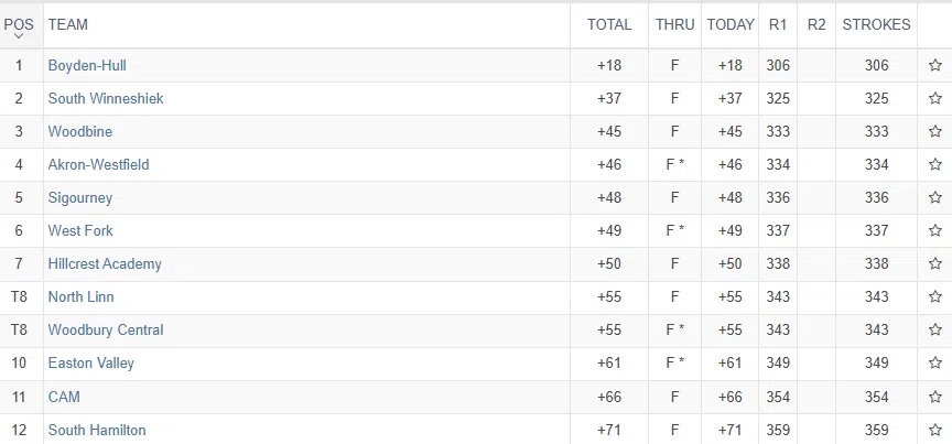(Waterloo) Boyden-Hull jumped out to an early lead at the Class 1A boys’ state golf tournament, firing a team score of 306 to top the 12-team field after the opening round at South Hills Golf Course. Woodbine sits in third place with a 333, while CAM heads into day two in 11th place after posting a 354.