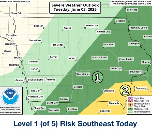 Dubberke says a few of these storms may become severe over southeast Iowa this afternoon into early this evening. Gusty winds and locally heavy rainfall are the primary threats—widespread rainfall totals of around 1 inch, with pockets of 2-inch totals from last night through tonight.