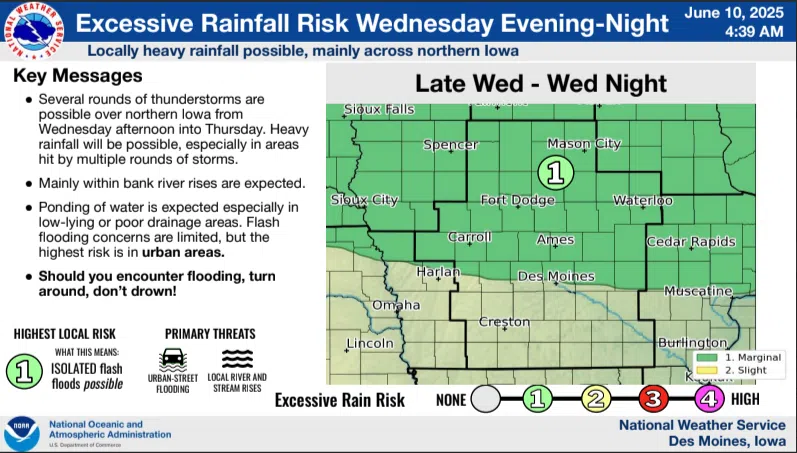 Severe weather is possible in the afternoon and evening, with heavy rain likely overnight. The primary threats are strong winds, hail, heavy rain, and localized ponding. Heavy rain is possible again on Thursday and Thursday night in northern and central Iowa.