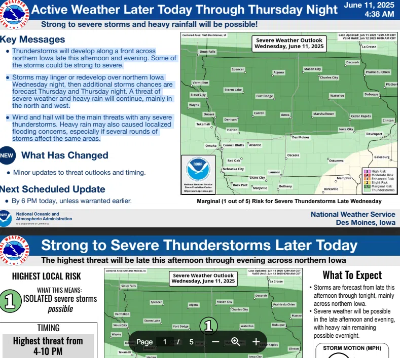 Thunderstorms will develop along a front across northern Iowa late this afternoon and evening. Some of the storms could be strong to severe. Storms may linger or redevelop over Iowa north tonight, then additional storm chances are forecast for Thursday and Thursday night. A threat of severe weather and heavy rain will continue, mainly in the north and west. Wind and hail will be the main threats with any severe thunderstorms. Heavy rain may also cause localized flooding concerns, primarily if several rounds of storms affect the same areas.