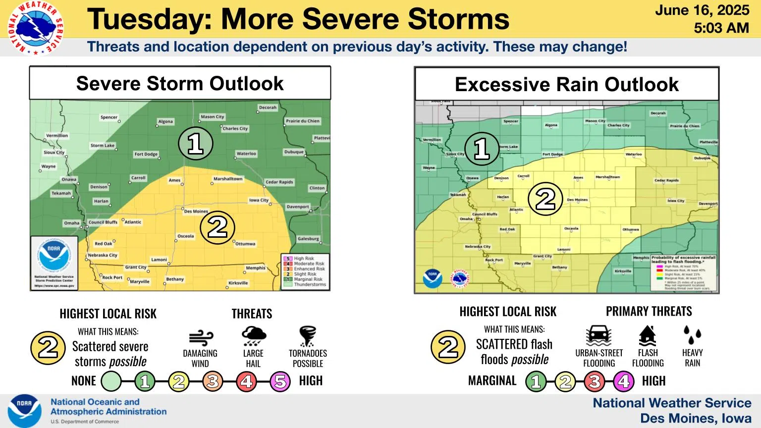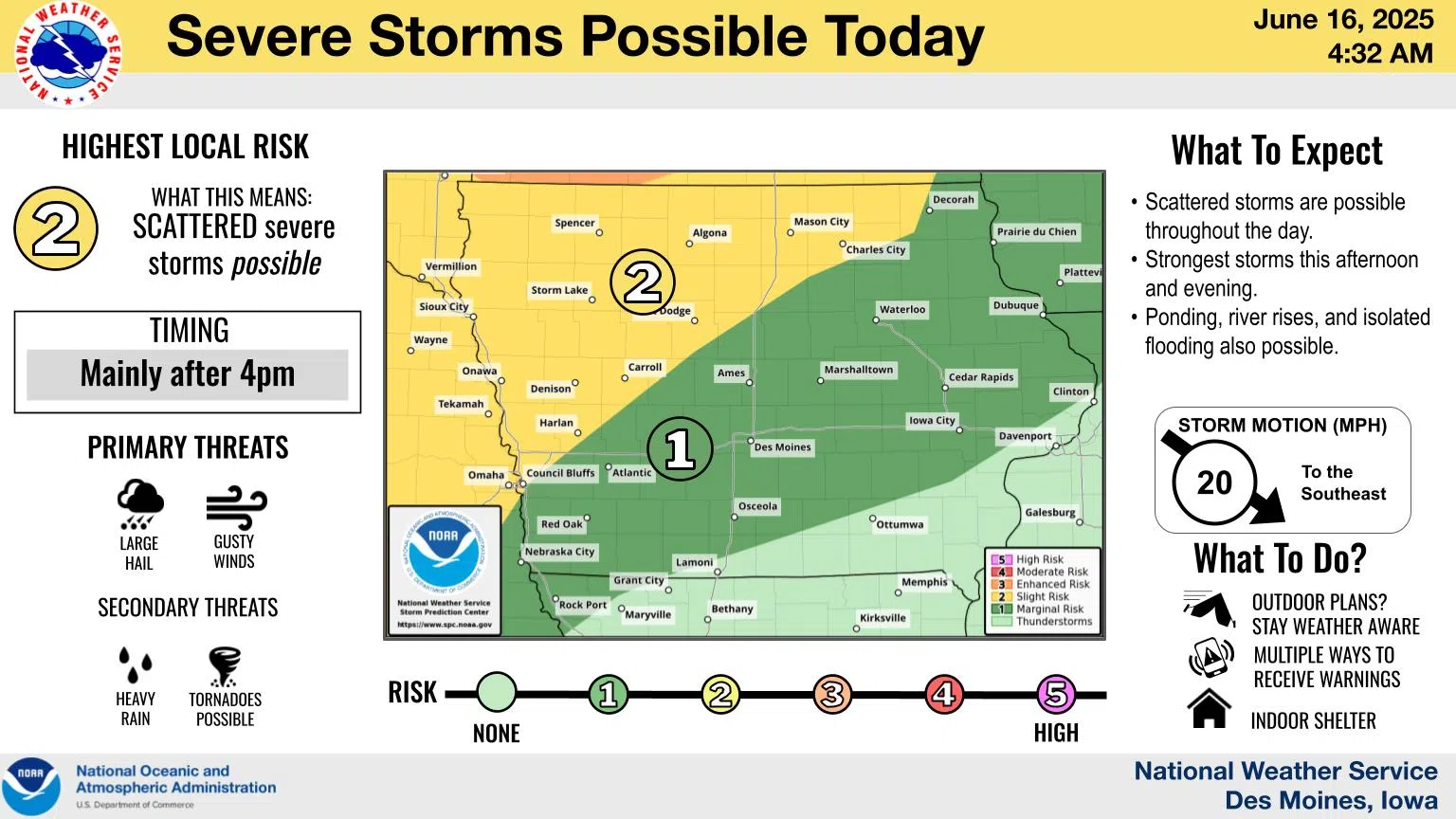The strongest storms are expected to occur in the afternoon and evening. A Slight Risk (Level 2 out of 5) for severe weather is expected over portions of northern and western Iowa, with a Marginal Risk (Level 1) for severe weather over much of central and southern Iowa. Large hail and gusty winds are the primary threats, though a few tornadoes are possible mainly north. Heavy rain again is expected with any storms, leading to the continued potential for ponding and river rises, along with isolated flooding.