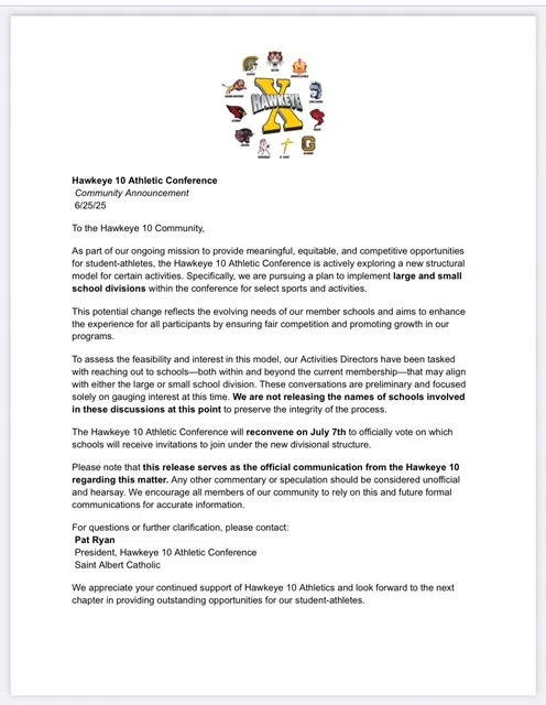 (Council Bluffs, IA) — The Hawkeye Ten Conference members had a meeting today and have vowed to explore changing the structure of its conference and pursue possible expansion. In a release by the President of the H-10 Conference Pat Ryan of St. Albert says “As part of our ongoing mission to provide meaningful, equitable, and competitive opportunities for student athletes, the Hawkeye Ten Athletic Conference is actively exploring a new structural model for certain activities. Specifically we are pursuing a plan to implement large and small school divisions within the conference for select sports and activities.”
