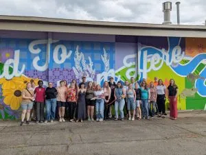 A large mural now spans the south and east sides of the old YMCA building at 703 E. 14th Street. Anna Segner, an Associate Teaching Professor at Iowa State University, was selected as an Innovation and Entrepreneurship Fellow, a position that came with funding support. Segner wanted to create a more community-based mural.