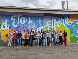 A large mural now spans the south and east sides of the old YMCA building at 703 E. 14th Street. Anna Segner, an Associate Teaching Professor at Iowa State University, was selected as an Innovation and Entrepreneurship Fellow, a position that came with funding support. Segner wanted to create a more community-based mural.