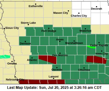 Communities at risk include Winterset, Greenfield, Stuart, Adair, St. Charles, Truro, Patterson, East Peru, Bevington, as well as the Winterset-Madison County Airport and Greenfield Municipal Airport. The Avenue of the Saints Event Center is also in the warning area.