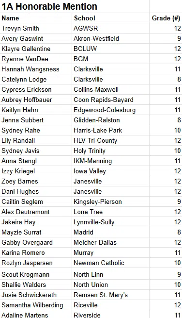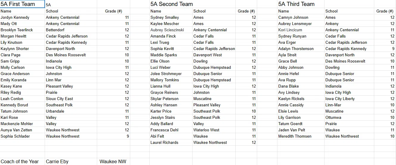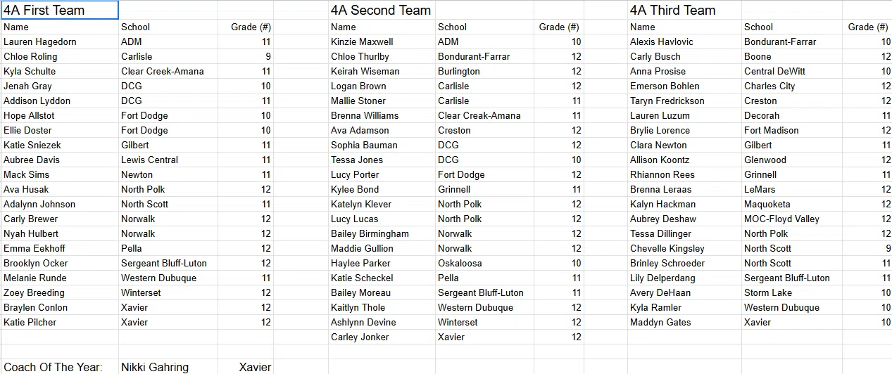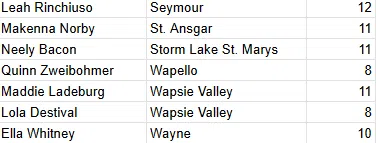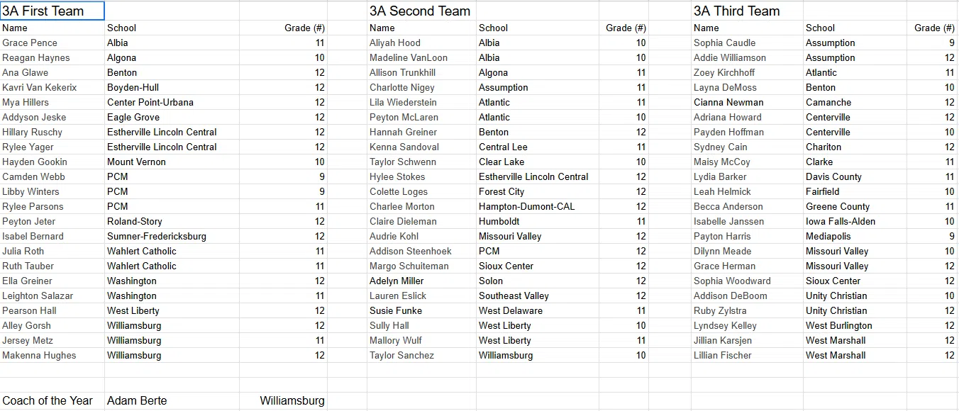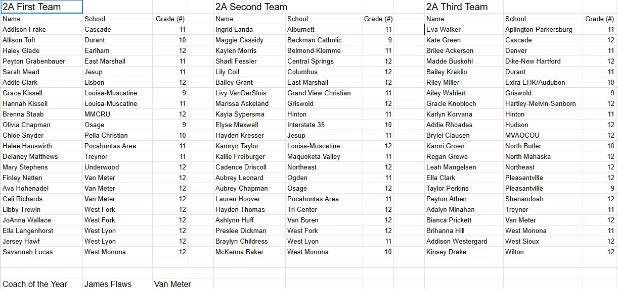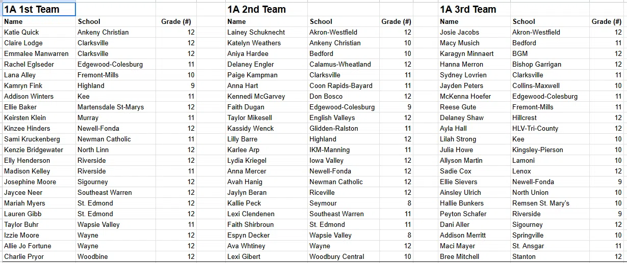 Riverside got four players honored in Class 1A — Senior Elly Henderson and Junior Madison Kelley were named to the first team, Freshman Peyton Schafer to the third team and Junior Adaline Martens to honorable mention.