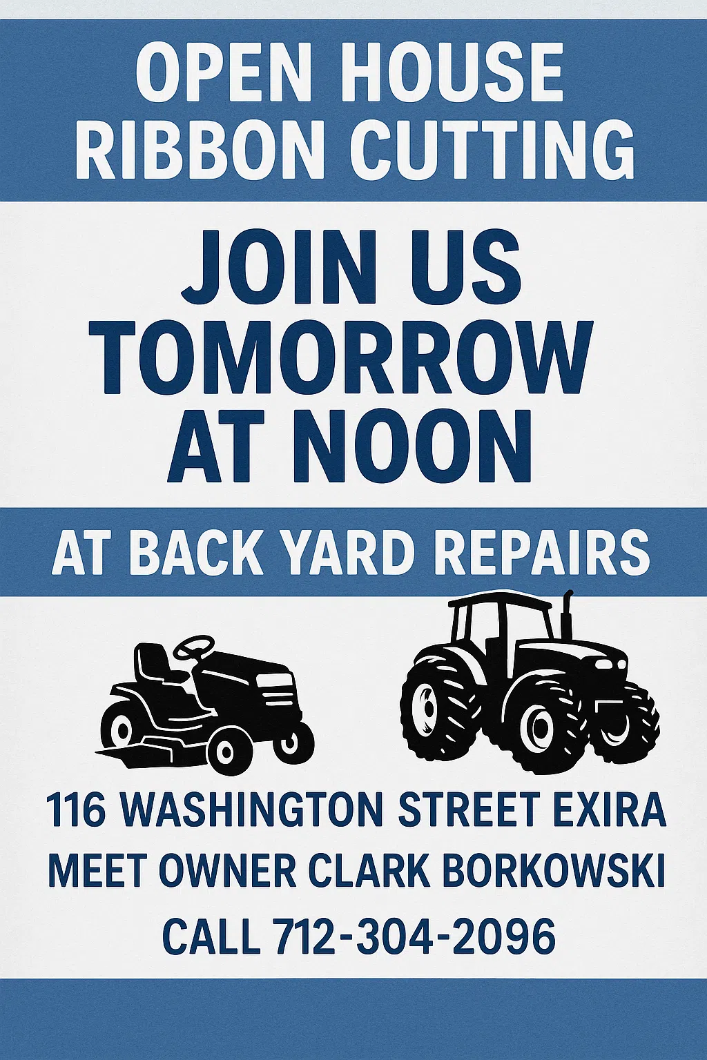 (Sponsored) Back Yard Repairs is celebrating its official Open House and Ribbon Cutting — and you’re invited! Join owner Clark Borkowski tomorrow at noon at the shop’s new location: 116 Washington Street in Exira. This is your chance to stop by, take a look around, and see what Clark has to offer when it comes to small engine and farm equipment repair. Whether it’s a four-wheeler, a lawnmower, or a full-size tractor, Clark brings experience and pride to every job.