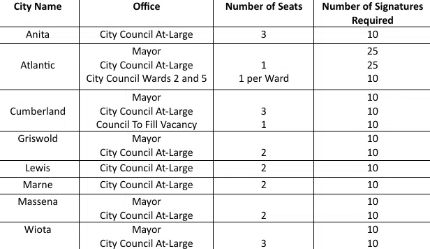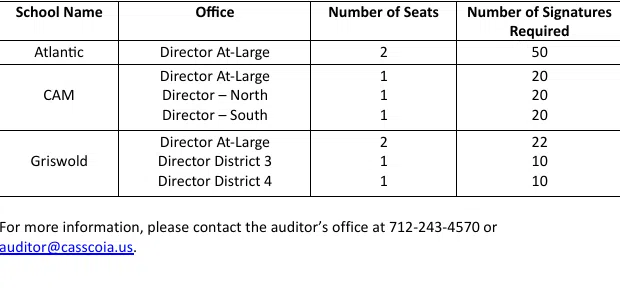 (Atlantic) Notice of Filing Period and Signature Requirements for City and School Board Candidates Cass County Auditor and Commissioner of Elections Kathy Somers hereby notifies residents of Cass County that the first day to file nomination papers for the upcoming City/School Election is Monday, August 25, 2025. The last day to file is Thursday, September 18, 2025, at 5:00 PM. City candidates shall file nomination papers with the county auditor. School board candidates shall file nomination papers with the respective school board secretary. Nomination papers may be circulated prior to the first date of filing and throughout the filing period. Nomination papers and candidate information are available in the auditor’s office and from the Iowa Secretary of State at www.sos.iowa.gov.