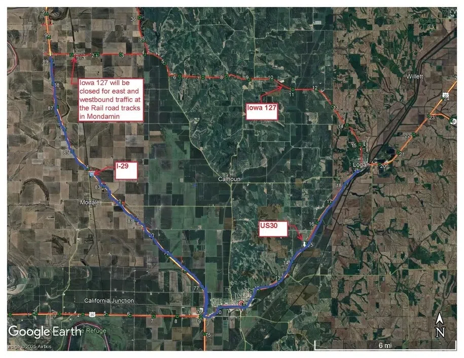 When the roadway is closed, you will follow a marked detour route by traveling on Interstate 29 to U.S. 30 near Missouri Valley, then travel on U.S. 30 to Iowa 127 to reach Mondamin.