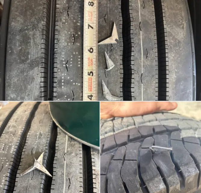 In a social media post on Friday, the Sheriff’s Office reported that local repair shops have been finding the devices lodged in vehicle tires, resulting in numerous flat tires. Some of the caltrops being recovered are more than an inch long.