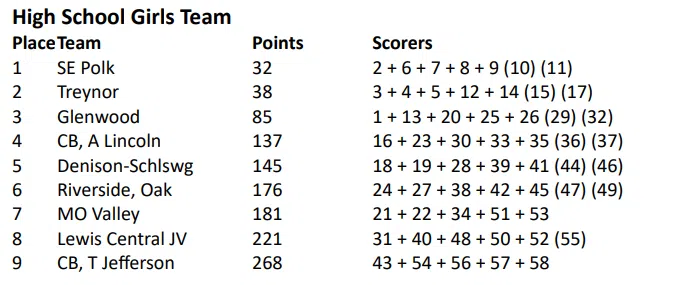 Treynor’s boys were 10th out of 11 teams but the Cardinal girls finished in 2nd place with 38 points, just 6 behind SE Polk with 32. Anne Miller was 3rd for Treynor with a time of 21:41.29. Lily Miller was 4th (21:41.31) and Madalyn Kermann was 5th (22:03.14).