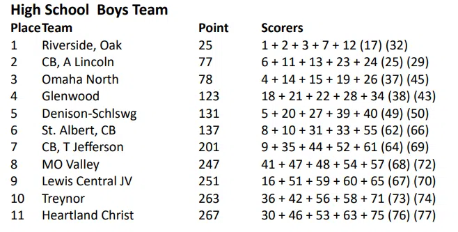 (Council Bluffs, IA) — On Saturday, Riverside started their cross country season and the boys ran away with a dominating win. The Bulldogs earned 25 points and was way ahead of 2nd place CBAL with 77 while Omaha North was in a close 3rd place with 78 points. Riverside had the top three finishers with Dawson Henderson (17:47.44), Brody Henderson (17:50.46) and Owen Fenner (17:53.71). Eli Hudnall was in 7th place (18:23.07) and Cruz Jaquez was 12th (19:03.36).