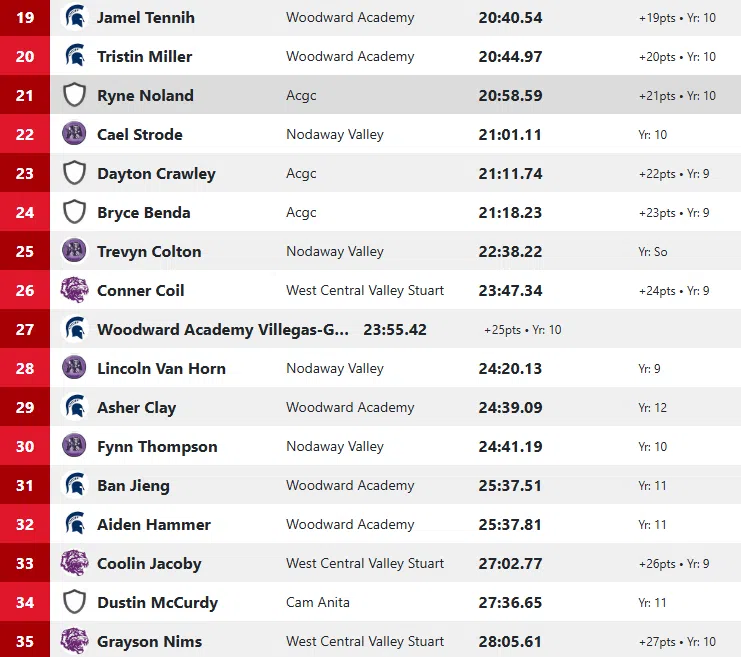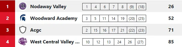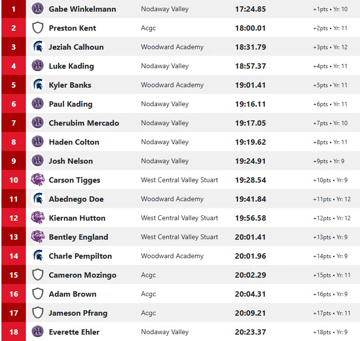 Gabe Winkelmann of Nodaway Valley was the winner at 17:24.85 finishing about 35 seconds ahead of Preston Kent of AC/GC at 18:00.01. Jeziah Calhoun of Woodward Academy was 3rd; Luke Kading of Nodaway Valley 4th and Kyler Banks of Woodward rounded out the top 5. Nodaway Valley won the team title with 26 points.