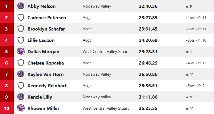 Abby Nelson of Nodaway Valley won the girls race at 22:40.36.