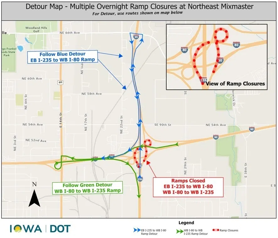 During these closures, westbound I-80 traffic wanting to reach westbound I-235 will exit at U.S. 69/Northeast 14th Street (exit 136) and then get back onto eastbound I-80/I-35 to reach westbound I-235.