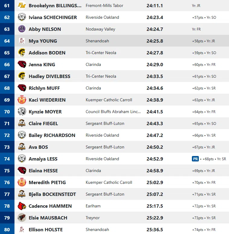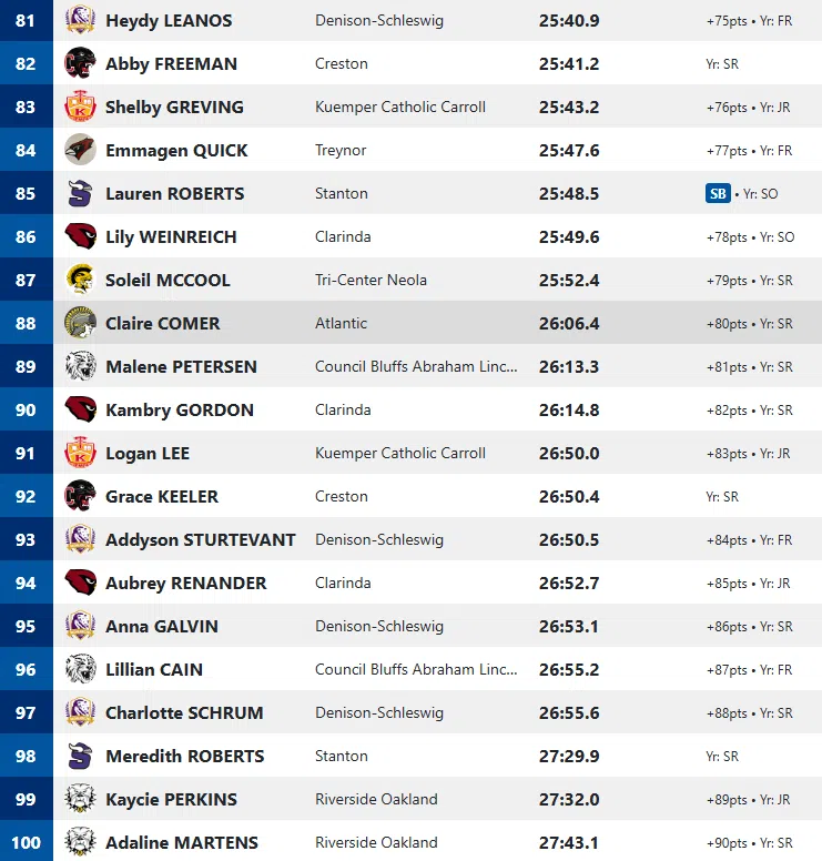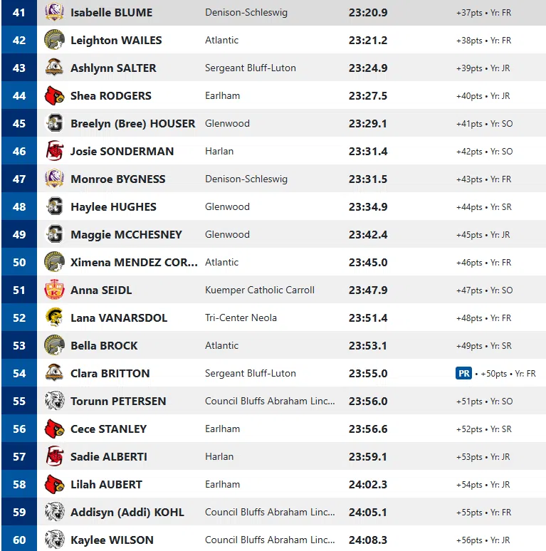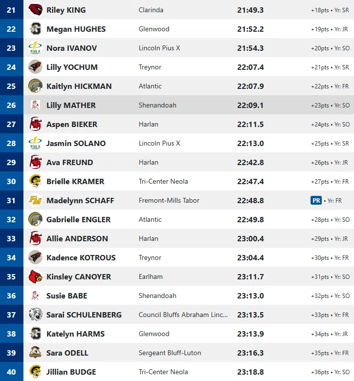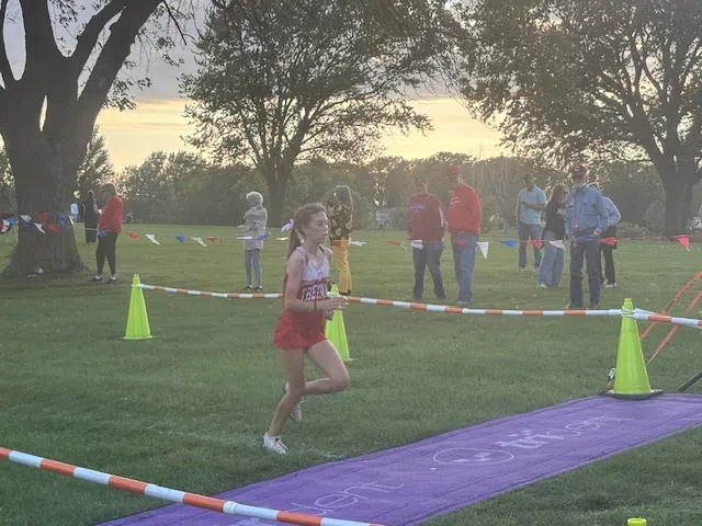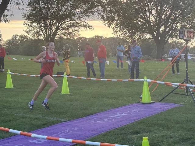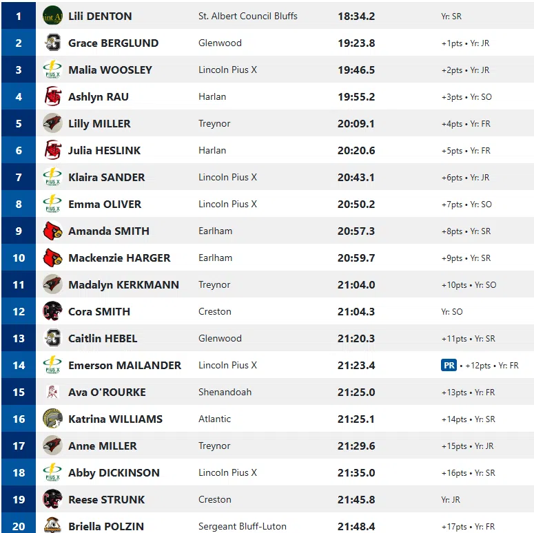 (Atlantic, IA) — Atlantic hosted their annual cross country meet on a gorgeous night at Nishna Hills Golf Course and Lincoln Pius X has dominated the team standings in recent years. Still, Lilli Denton of St. Albert has also dominated the individual race. Denton won easily by 49 seconds over Grace Berglund of Glenwood — 18:34.2 to 19:23.8. Malia Woosley of Lincoln was 3rd, Ashlyn Rau of Harlan 4th (19:55.2) and Lilly Miller of Treynor 5th (20:09.1). Julia Heslink of Harlan finished 6th (20:20.6).