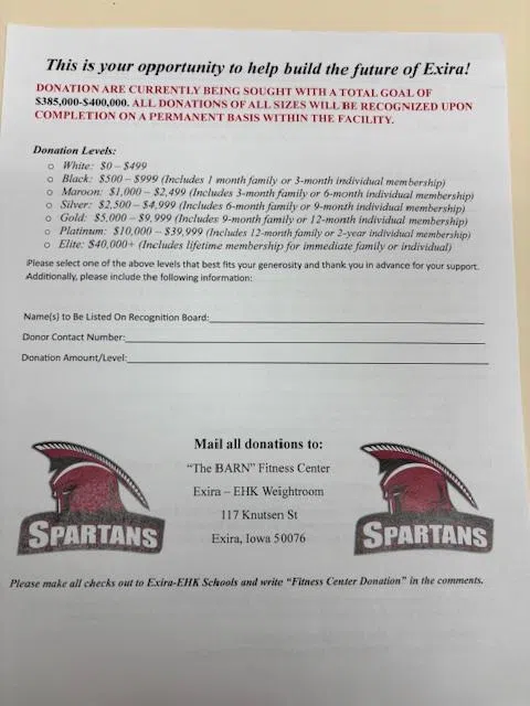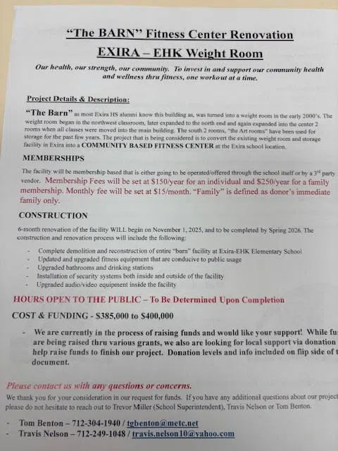 If you are interested in donating to refurbish “The Barn”, mail your donations to the Exira EHK Weight Room, 117 Knutsen St., Exira, IA 50076.