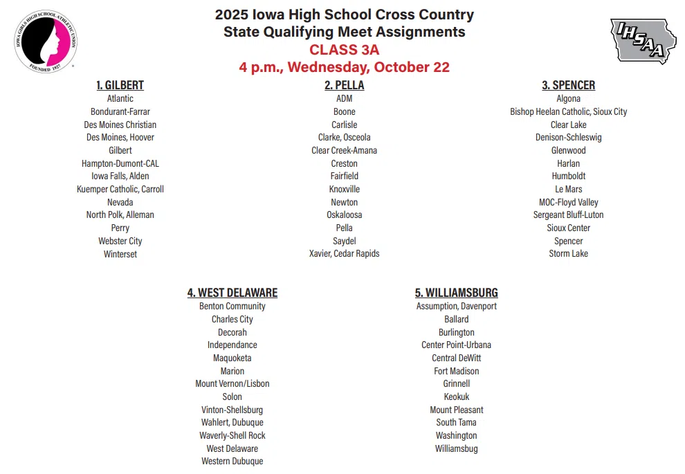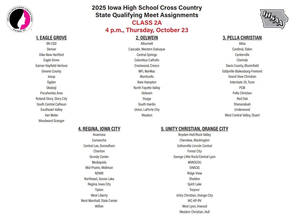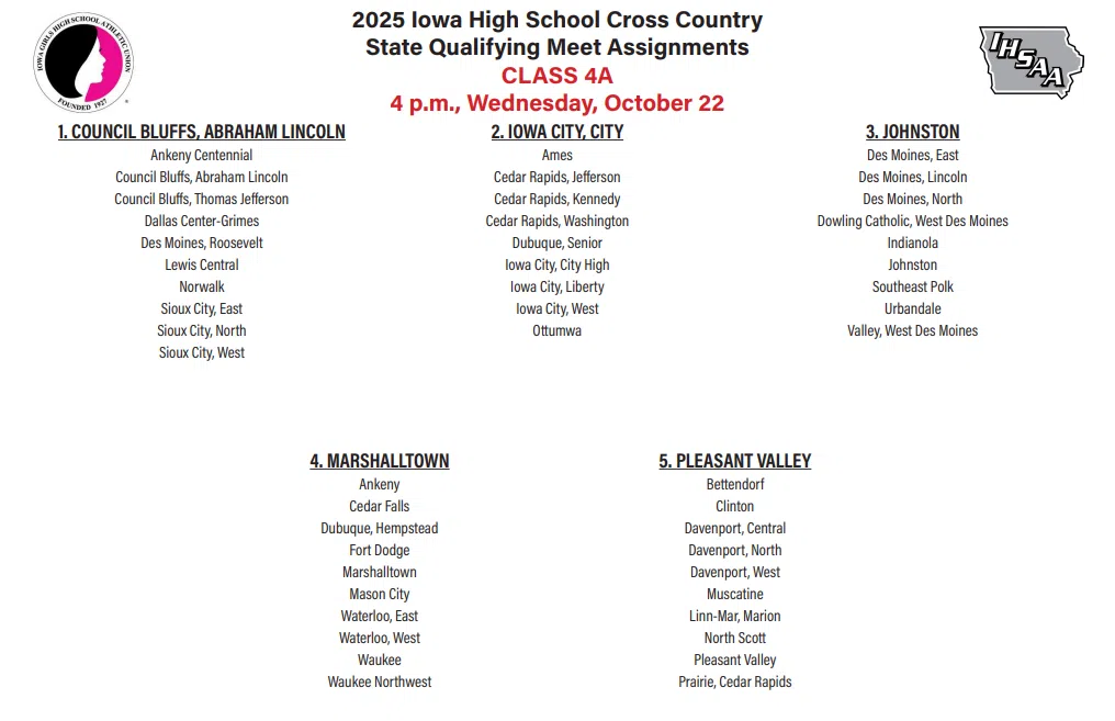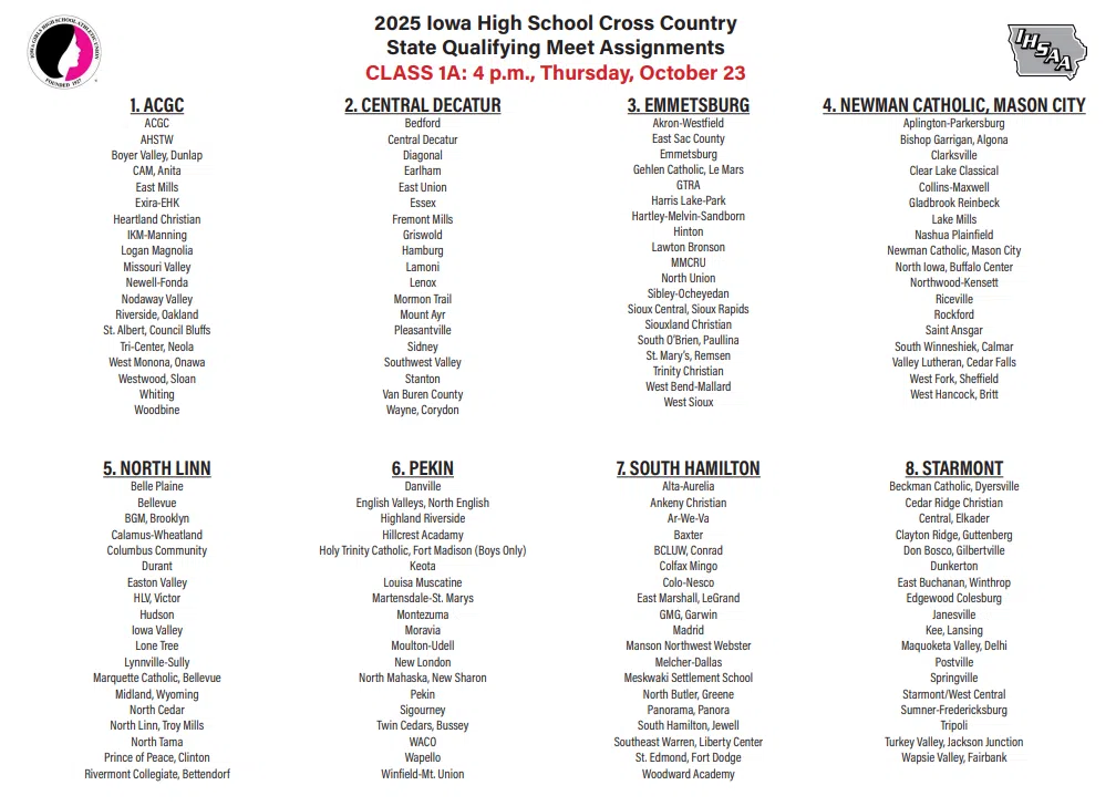 (Area) — The Iowa High School Athletic Association and the Iowa Girls High School Athletic Union have both released the assignments for the cross country state qualifying meets which will be held next week. 3A and 4A will be run on Wednesday, October 22 while 1A and 2A will be run on Thursday, October 23.