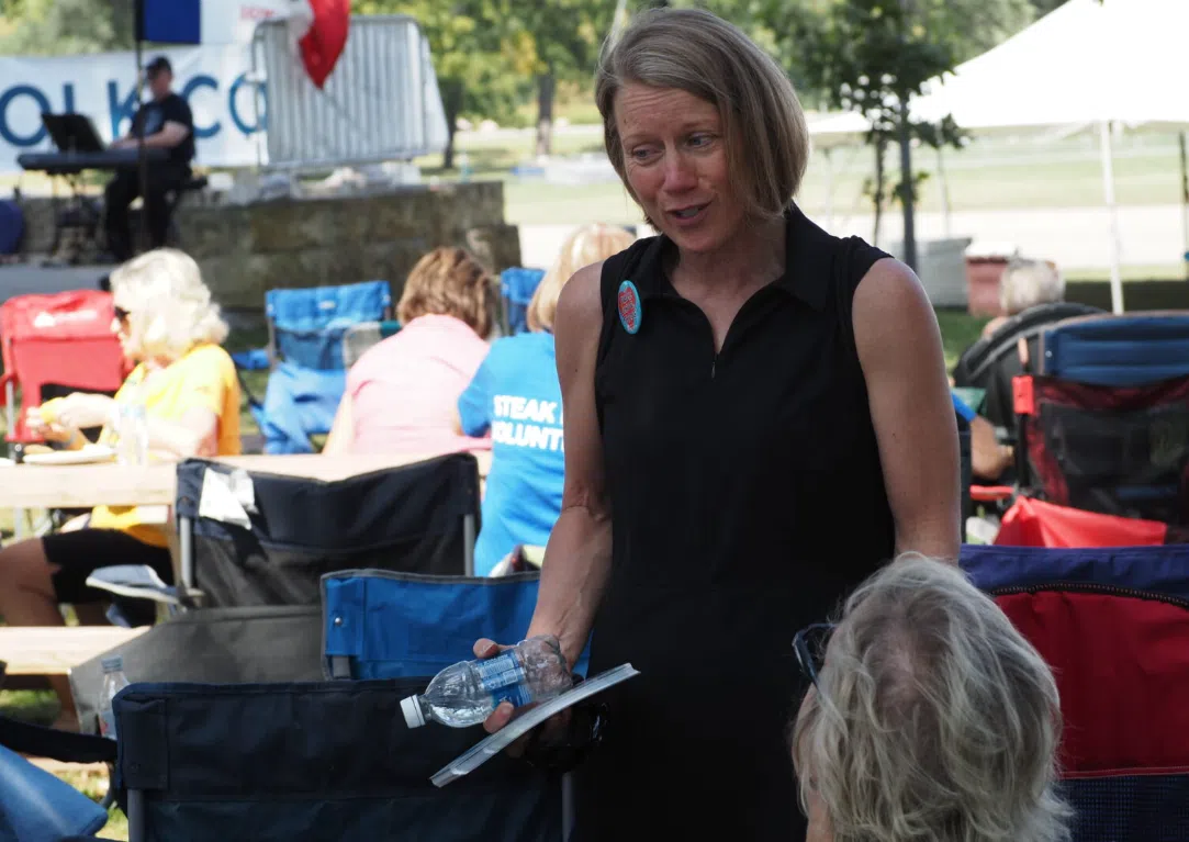 Iowa Capital Dispatch story written by Robin Opsahl. Des Moines school board chair Jackie Norris, who was running for U.S. Senate, spoke to Iowans at the Polk County Democrats’ Steak Fry in Des Moines on September 13, 2025. (Photo by Robin Opsahl/Iowa Capital Dispatch)