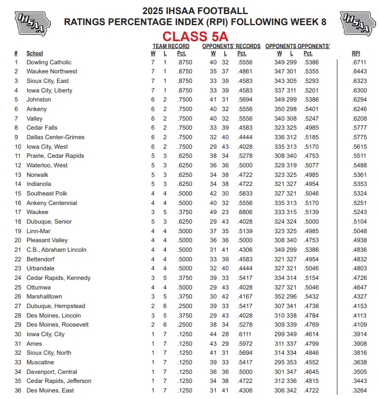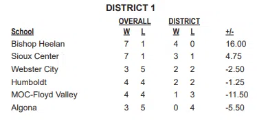 Bishop Heelan has clinched the district title and visits Algona this week. Sioux Center hosts Humboldt and Webster City visits MOC Floyd Valley. If Sioux Center wins, they get the #2 seed. A Humboldt win and a Webster City win means its a three way tie and it will go to a tiebreaker.