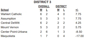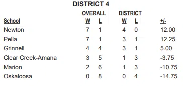 Newton has clinched the district title and host Marion this week. Pella visits Grinnell and the winner will be a #2 seed. The Dutch will be an at large team if they lose. Oskaloosa visits Clear Creek Amana in the other game. This district likely will only have two teams in the post-season.