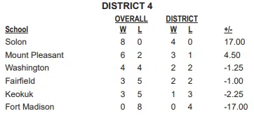Solon has clinched the district title and visit Fort Madison this week. Mount Pleasant is at Fairfield and Washington visits Keokuk. A Fairfield win and a win by the Demons and there is a three way tie. If Mount Pleasant wins, they get the #2 seed. Washington and Fairfield have an outside chance with a victory to move up in the RPI for an at large.