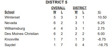 This district is wide open. Williamsburg hosts Saydel so the Raiders have the best chance at an automatic bid. Nevada is at Knoxville so the Cubs have a good chance as well. The other game is DMC at Winterset — if the Huskies win its a three way tie. If the Lions win, DMC and Winterset would be tied for third and assuming Williamsburg and Nevada win, they get the at large bids. All four teams are in the running for at large bids as well. Nevada is currently #7 and DMC is #8 in the RPI with Winterset #13. There is a good chance an at large bid comes from this district.