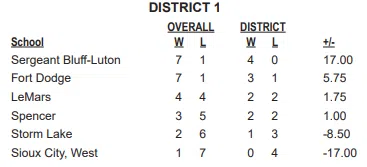 Sergeant Bluff Luton has clinched the district title — the Warriors visit Spencer this week. Fort Dodge needs a win at Sioux City West to clinch the #2 seed. There is a chance for a three way tie if the Dodgers lose, Spencer wins and Le Mars beats Storm Lake. Le Mars is currently #14 in the RPI and are on the bubble for an at large.