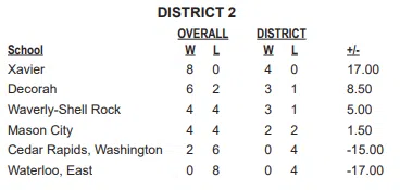 Xavier has sewn up the district title and #1 seed — the Saints visit Mason City. Waverly Shell Rock visits Decorah and the winner gets the #2 seed. Decorah is currently 10th in the RPI so a loss and they could get an at large. Mason City would need a win over Xavier to be considered a playoff team. Cedar Rapids Washington visits Waterloo East and they are both eliminated from playoff contention.