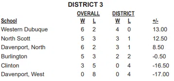 Western Dubuque has beaten both North Scott and Davenport North so they have clinched the district title. There cannot be a three way tie because North Scott visits Davenport North this week and the winner will be the #2 seed. North Scott is 12th in the RPI and Davenport North 13th so the loser would probably be eliminated from the at large spots. The Bobcats visit Burlington and Davenport West is at Clinton.