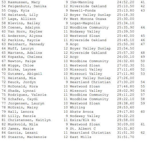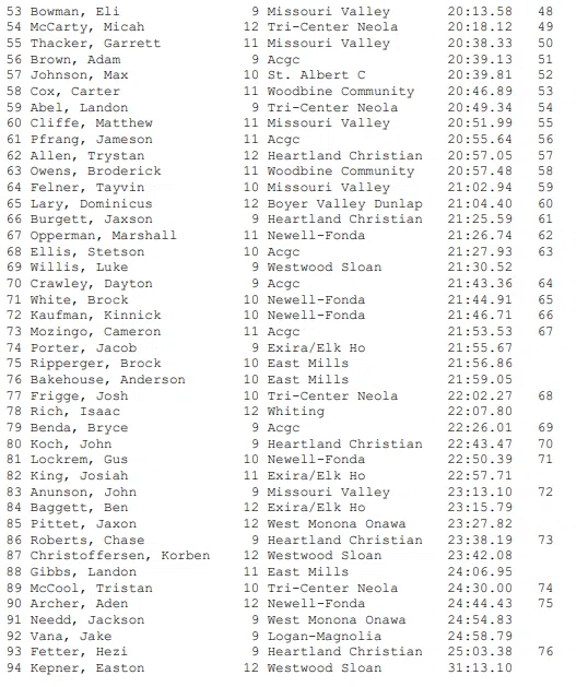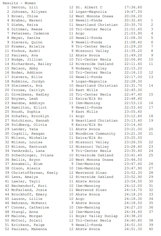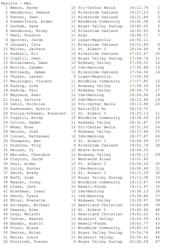 On the girls side, Lilli Denton of St. Albert has never lost a race and that record is still intact. Denton finished just over 2 minutes ahead of Allysen Johnsen of Logan Magnolia. Denton’s time was 17:36.60 while Johnsen ran 19:47.50. Chloe Broer of West Monona 3rd, Mareni Brabec of Newell Fonda 4th, Keira Diehm of Heartland Christian 5th, Reese Dittmer of Tri Center 6th, Cadence Petersen of AC/GC 7th, Danika Meyer of Newell Fonda 8th, Quinn Sievers of Newell Fonda 9th and Brielle Kramer of Tri Center 10th.
