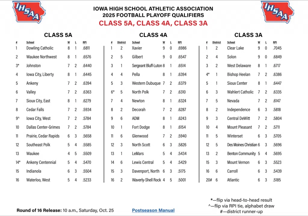 (Boone) The Iowa High School Athletic Association released its’ Class 5A, 4A, and 3A Football Play-off qualifiers. Glenwood and Lewis Central qualified for postseason play in Class 4A. Atlantic, and Winterset are in Class 3A. The IHSAA will release next week’s pairings for all classes 8-Man through 5A at 10:00 a.m. this morning.