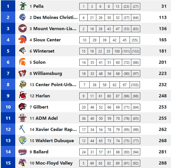 Senior Marissa Ferebee of Pella won her third straight state title, winning by 15 seconds at 17:47.9. Ferebee led the Dutch to the team title with 31 points. Des Moines Christian was 2nd at 113 and Mt Vernon Lisbon 3rd with 136.
