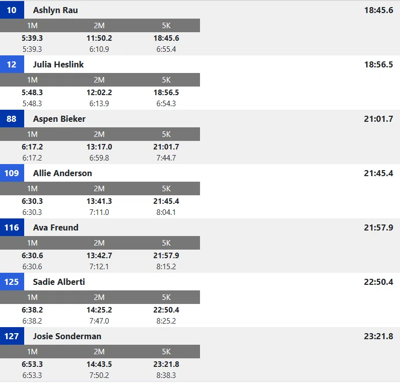 Junior Grace Berglund of Glenwood finished 23rd (19:21.0). Senior Caitlin Hebel of Glenwood finished 73rd (20:33.5). There were 132 runners that finished the race.