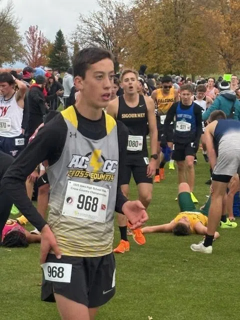 Sophomore Haven Weers of Tri Center finished in 4th place at 16:11.2. David Nichols of Earlham got on the deck in 8th (16:37.1) and Dane Gorham of Boyer Valley was all-state in 9th (16:38.8). The 1A individual champ was Hugh Conway of South Winneshiek with a PR time of 15:50.7. Hayden Thompson of Lake Mills was 2nd and Knute Rogne of Lake Mills finished 3rd.