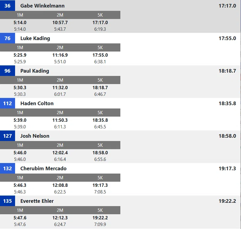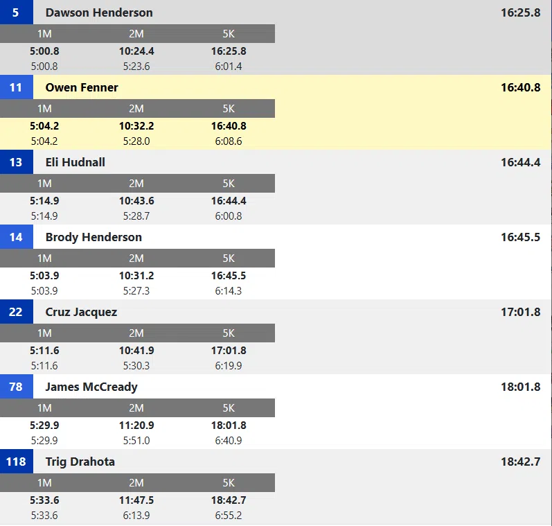 Preston Kent of AC/GC had a solid race finishing in 28th place (17:06.2). Jacob Sporrer of Logan Magnolia was 27th (17:05.7). There were 152 runners in the field.