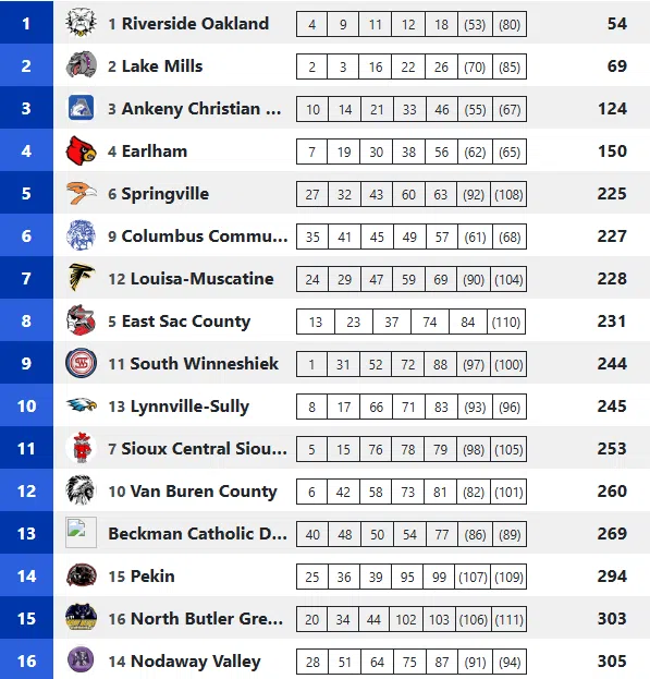 Riverside had 54 points, Lake Mills 69 and Ankeny Christian 3rd with 124. Earlham was 4th with 150.
