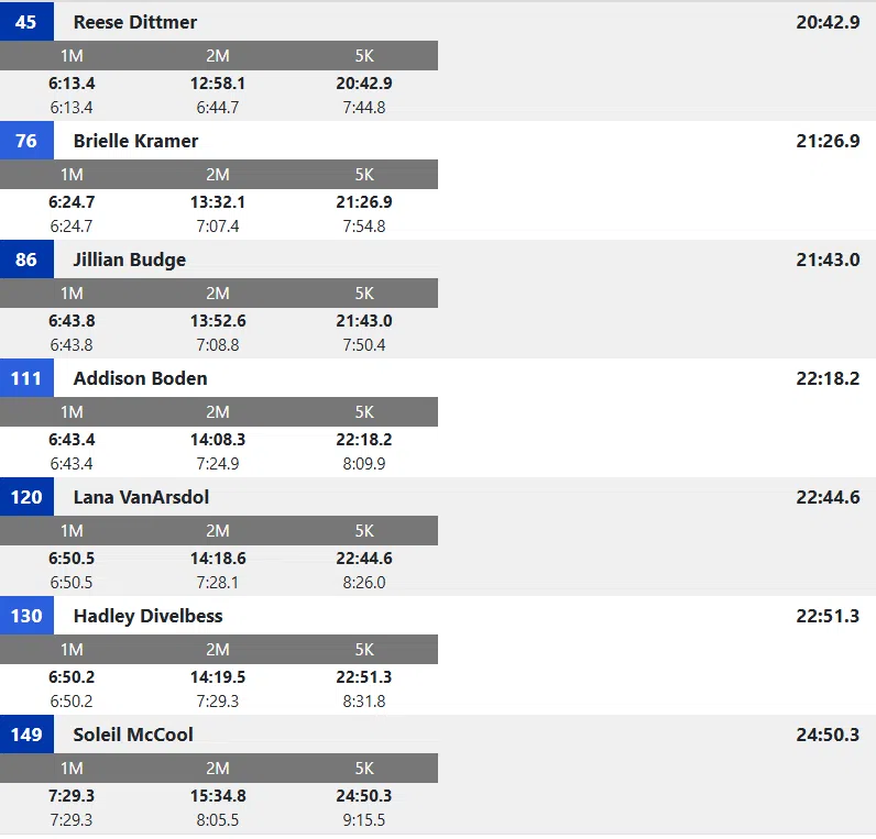 Allysen Johnson of Logan Magnolia was 23rd (20:00.7); Reese Dittmer had the best finish for Tri Center in 46th (20:42.9); Cadence Petersen of AC/GC was 89th (21:50.8). There were 158 runners in the field.