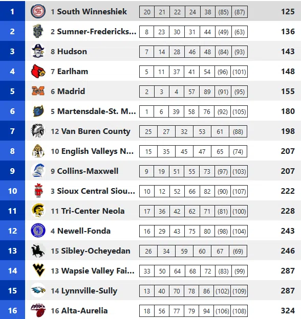 South Winneshiek won the team title with 125 points, Sumner Fredericksburg was 2nd at 136 and Hudson finished 3rd at 143. Earlham was 4th at 148. Tri Center finished 11th with 228 points — there were 16 total teams.