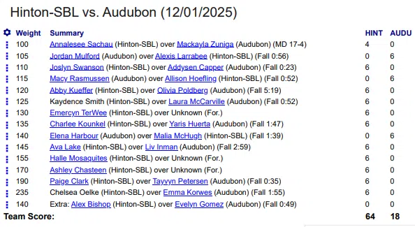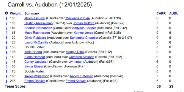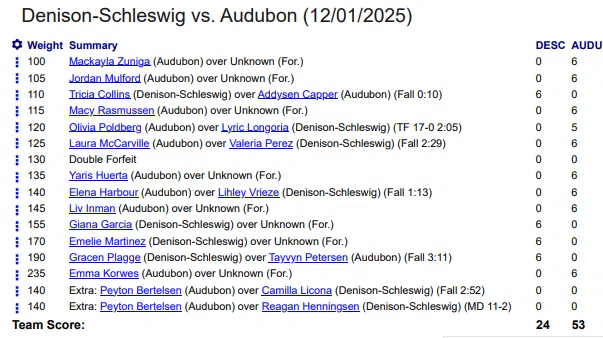 (Denison, IA) — Audubon girls wrestling went 1-2 in duals at Denison Schleswig on Monday night — beating D-S 53-24, losing to Carroll 36-29 and losing to Hinton-Sgt. Bluff Luton 64-18. Elena Harbour went 3-0 with 3 falls, Macy Rasmussen went 2-0 with 2 falls, and Olvia Poldberg went 2-1 with 2 tech falls.