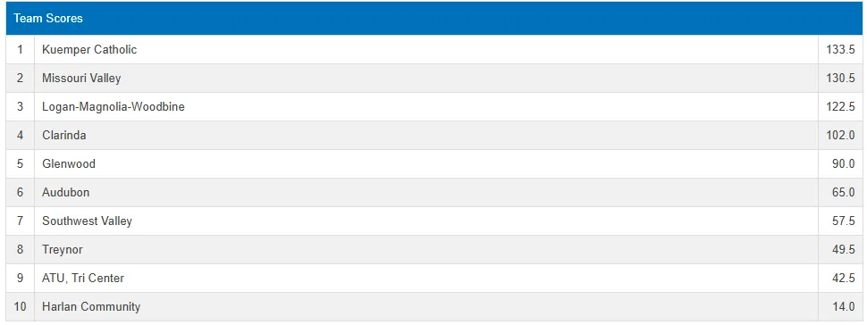 (Treynor, IA) — Kuemper Catholic came away with a team win at the Treynor Tournament on Thursday night. The Knights had 133.5 points and edged out Missouri Valley by just three points. Logan Magnolia-Woodbine was 3rd with 122.5. Clarinda and Glenwood rounded out the top 5 in the 10 team tourney.